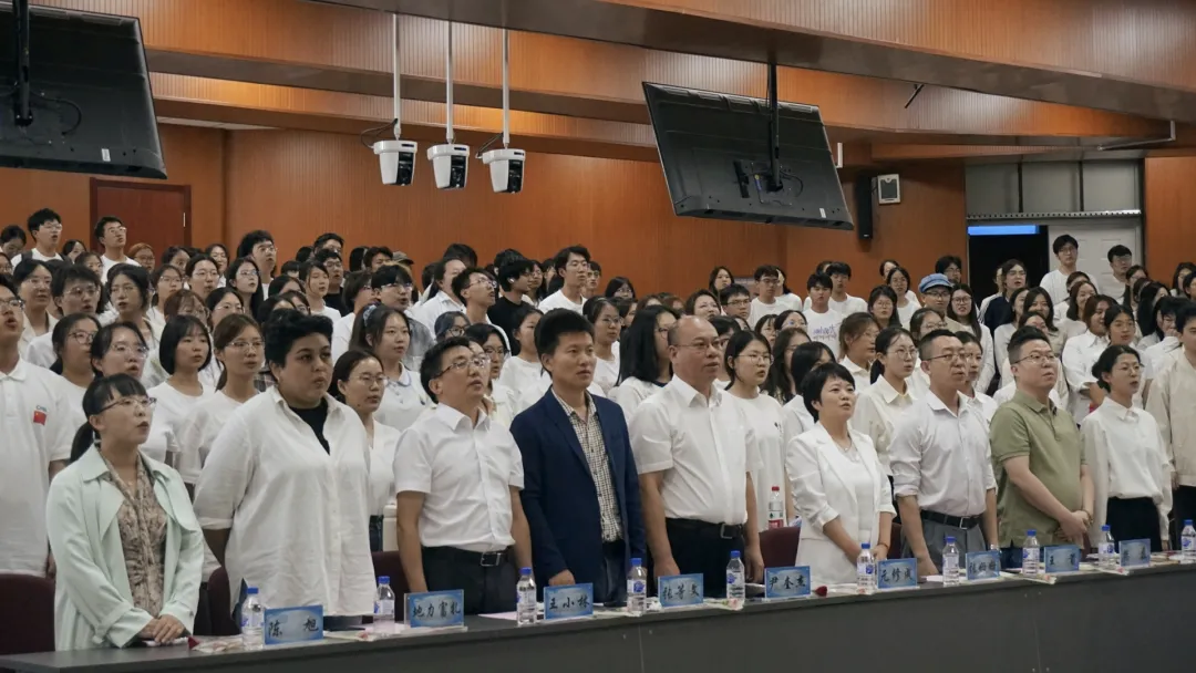 典礼第一项,奏唱中华人民共和国国歌。全体师生肃立齐唱,歌声回荡在会场,庄严而神圣,宣告着新征程的开启。