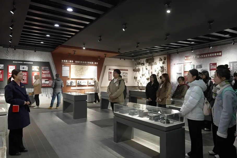 在东北抗联文化展示馆内,师生党员们循着专业讲解员深沉而富有感染力的声音,沉浸于那段烽火连天的岁月。展柜中,一件件饱经沧桑的文物静静陈列都在无声地诉说着当年的艰苦卓绝,这些不再是教科书上遥远的故事,而是通过一份份泛黄的文献档案,化作了有血有肉的生命印记。师生们时而在一件文物前长久驻足,凝视那上面的岁月痕迹,试图与历史对话。这一段沉浸式的参观,必将让忠贞报国的爱国主义精神与革命英雄主义气概,深深植根于每位党员心中,化为砥砺前行的不竭动力。
