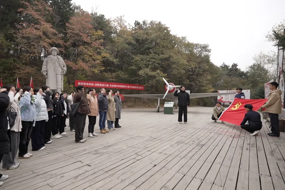 随后,在庄严肃穆的氛围中,全体师生党员列队肃立于鲜艳的中国共产党党旗前举行了重温入党誓词仪式。在领誓人的带领下,大家高举右拳,目光如炬,凝视着象征信仰与方向的党旗,字字铿锵,重温了对党的忠诚誓言。熟悉的誓言再次响彻云霄,字字千钧,句句入心。那不再仅仅是记忆中的文本,而是从胸膛中迸发而出的赤诚与坚定。这一刻,时空仿佛凝固,抗联先烈们曾经的誓言与此刻青年一代的承诺跨越时空,交汇共鸣。